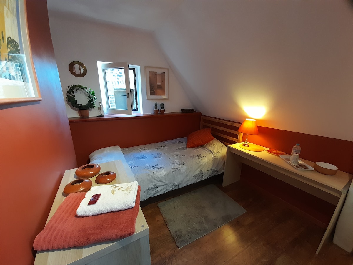 Charmant et chaleureux appartement entièrement rénové sur 2 niveaux. L appartement très lumineux est situé au 1 étage d une maison au cœur du centre ville dans une rue calme à moins de 300 m de la grand place. Au premier niveau le salon et la cuisine américaine entièrement équipée. Le deuxième niveau s ouvre sur une spacieuse chambre avec un lit double, la salle de bain avec douche et wc et l’accès à une terrasse privée donnant sur les toits de la ville. Parking payant à proximité