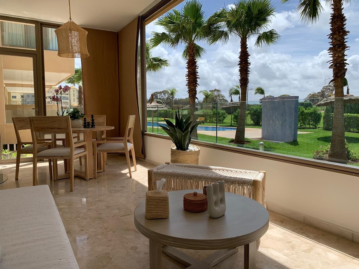 Suited for Married couples or families! Residence located in the costal area of Bouznika, between15min Rabat and 20min Casablanca. Welcome to the Peaceful place at Bouznika appartment located in a calm residence with pool and a garden and secured parking. The apprt is located for a 5min distance from bakery, restaurant and local food supermarket groceries and café shops. The appartment has a parking and Wifi , international being channel You are welcome !