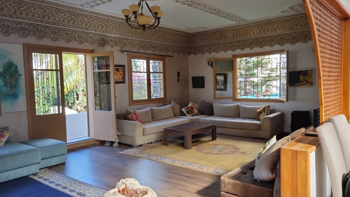 Très belle villa avec grand jardin arboré et piscine en angle. Deuxième piscine commune. Salon et salle à manger. Suite parentale avec véranda et salle de bain. 2 autres chambres avec salle de bain commune. 4eme chambre avec sdb au RDC. Cuisine équipée. Salon et table dans la pergola vitrée. Plage "privée" à 4 minutes à pied. Calme et sécurisée. Golf, surf, cafés et restaurants à proximité. Emplacement idéal pour visiter les autres villes du Maroc. Fêtes non autorisées sauf repas de famille.
