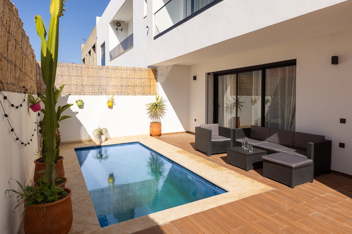 Welcome to Beach Vibe Villa — your perfect getaway just a 2-minute walk from the beach in sunny Bouznika! This spacious villa offers 5 cozy bedrooms for up to 10 guests. Enjoy a private swimming pool, pool table, fully equipped kitchen, and a traditional hammam beldi. A beach club and surf club are just a short stroll away. Whether it’s a chill trip with friends or a family holiday, this villa has everything for a fun and relaxing stay by the sea.