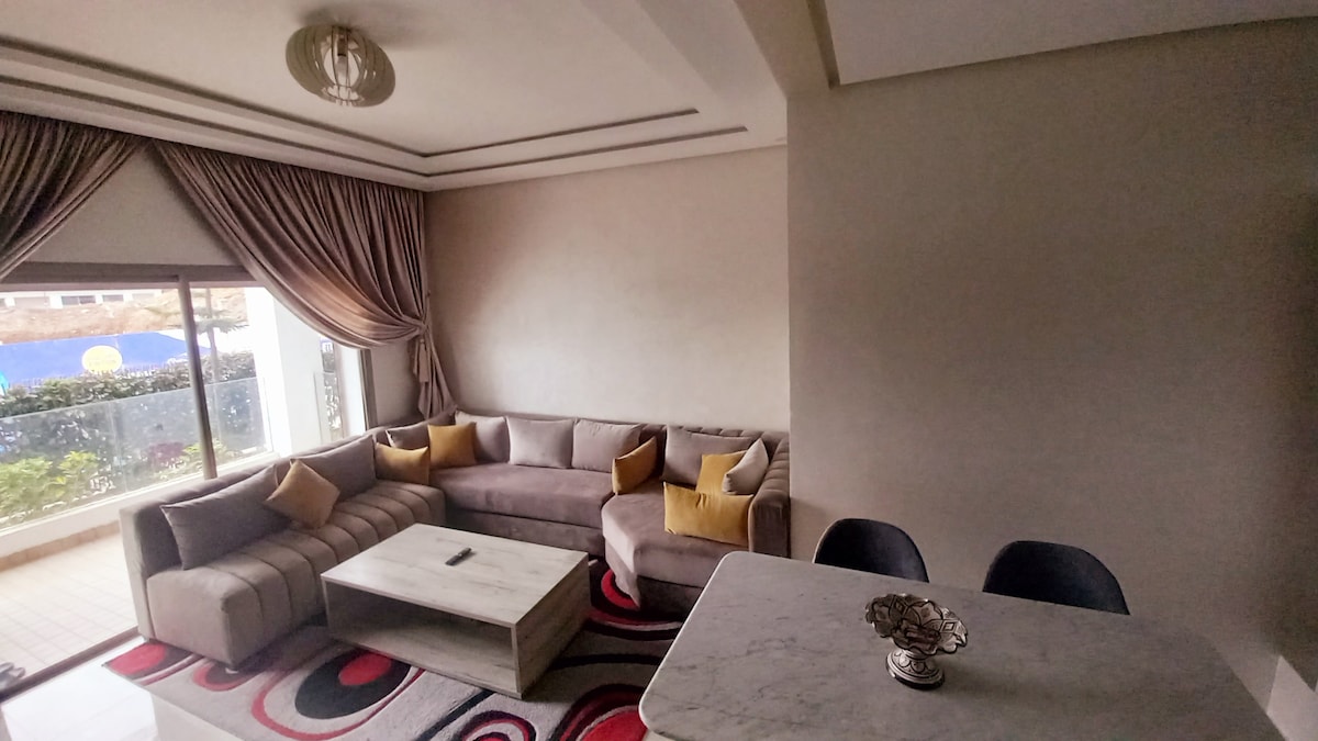 ☀️ Seaside Escape in Bouznika! Luxury 2-bedroom, 2-bathroom apartment at Évasion Bouznika — perfect for families, couples, or friends. Enjoy: 🌊 Sea view & quick walk to the beach 🏊 Direct pool access from your private terrace 🛏️ 2 bedrooms + bright living room 🛁 2 full bathrooms for extra comfort 🍽️ Fully equipped kitchen, WiFi, free parking Located in a calm, secure residence with 24/7 security. ✨ Comfort, sunshine & relaxation guaranteed!
