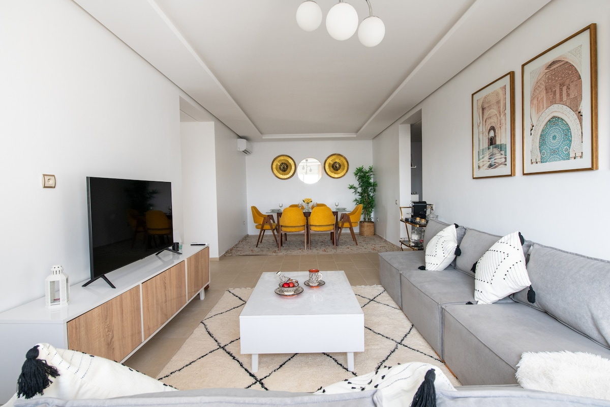 Offrez-vous une parenthèse de douceur dans ce superbe appartement cosy, baigné de lumière et décoré avec goût, au cœur du quartier prisé d’Agdal à Rabat. Ambiance chaleureuse et confort moderne vous y attendent. À deux pas des meilleurs restaurants, cafés et boutiques de la ville, c’est l’endroit rêvé pour se détendre, explorer et profiter pleinement de Rabat, en famille, entre amis ou en amoureux. Laissez-vous séduire par le charme unique de ce lieu plein de vie.