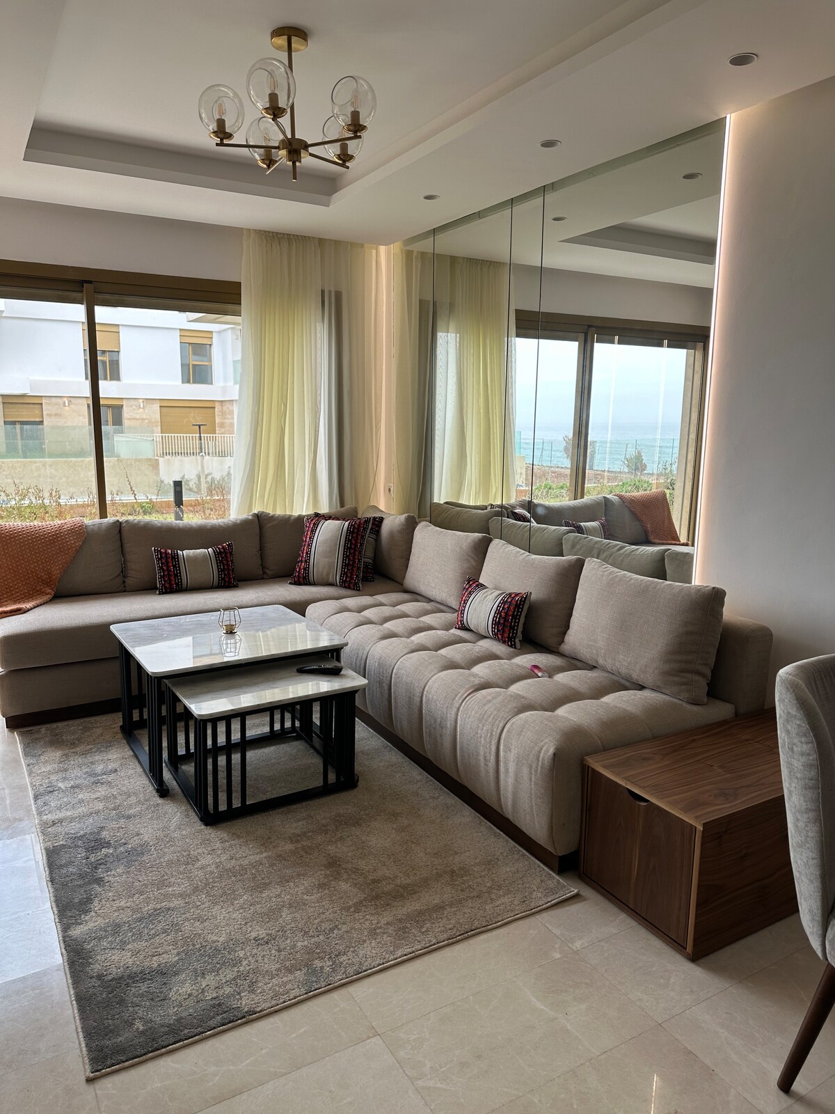 Située en face du nouveau « Mall du carrousel », Profitez d'un logement élégant et unique dans la prestigieuse résidence ‘Le phare du carrousel’ en bord de mer au cœur de Rabat. Elle est dotée d’une salle de fitness,terrain de foot, espace de sport extérieur, espace de jeux pour enfant et une piscine. L’appartement se distingue avec sa belle vue sur mer et sur piscine à partir de sa terrasse et son jardin privatif. Un petit havre de paix luxueux, meublé et décoré par Inn design studio.
