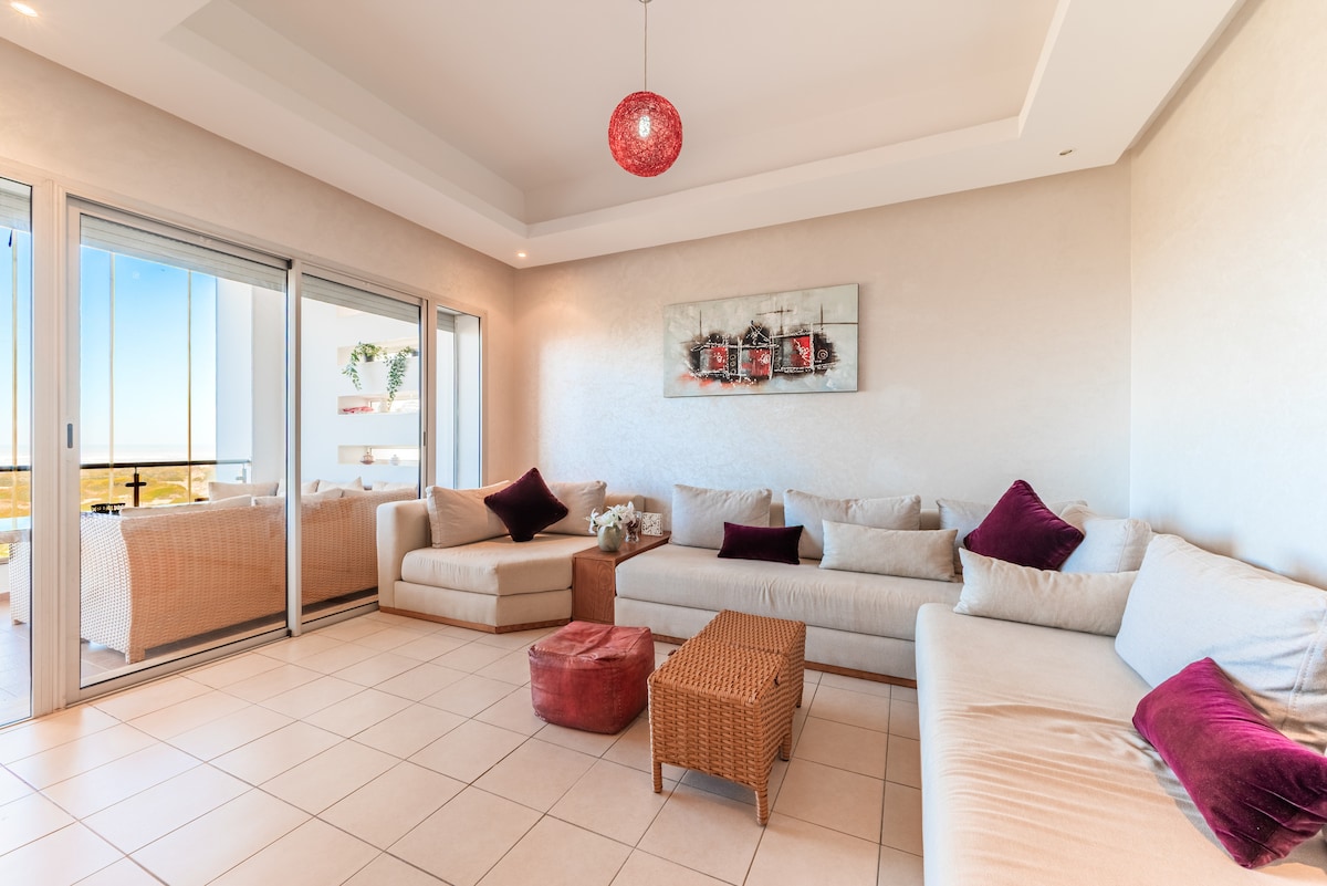 Profitez d'un nouveau logement décoré et vivant de la ville de Mohammedia. Entièrement équipé et d'une superbe vue sur la mer depuis la terrasse en orientation SUD. L'appartement est dans une résidence sécurisée (24/24 H) au cœur du parc de Mohammedia. - 5 mn à pied de la plage - 2 KM de la gare - 25 km de la mosquée Hassan II Cet établissement met à votre disposition un ascenseur, un service de sécurité et nous présentons une facilité de check-in et check-out grâce à notre serrure connectée.