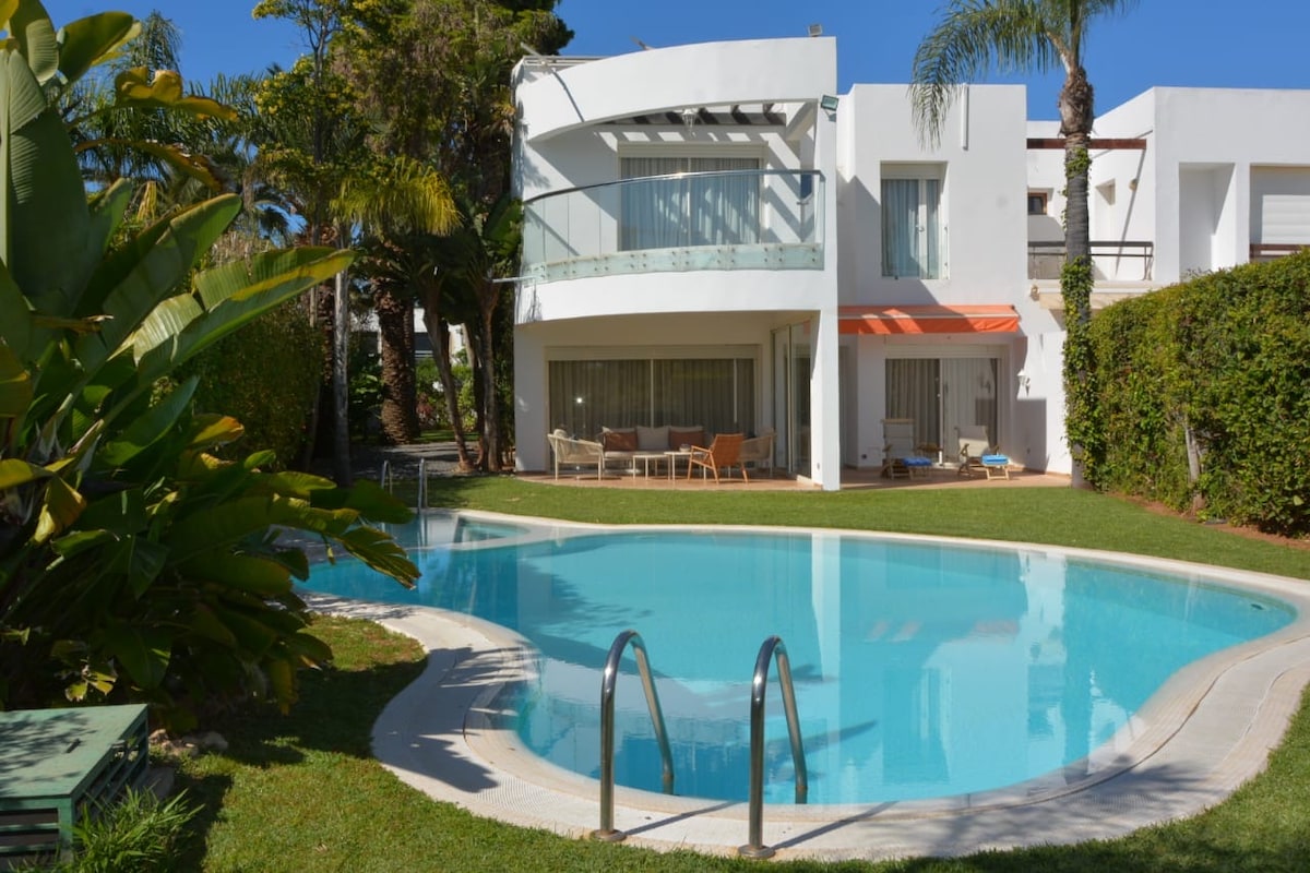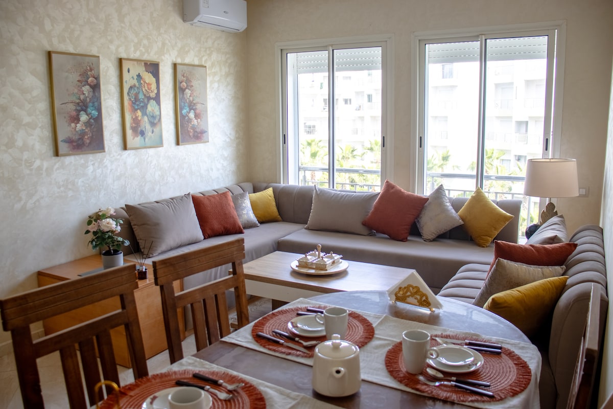 Welcome to our lovely apartment! Nestled just a short 20-minute walk away from the beautiful beach, it's a mere 5-minute drive if you prefer to take the car. For those keen on exploring, the train station is a convenient 5-minute stroll, making it easy to reach your desired destinations. You'll also appreciate the fact that Rabat is just a quick 20-minute drive away. A lot of people come here and say that they really like it. (La piscine est ouverte tous les jours sauf le lundi)