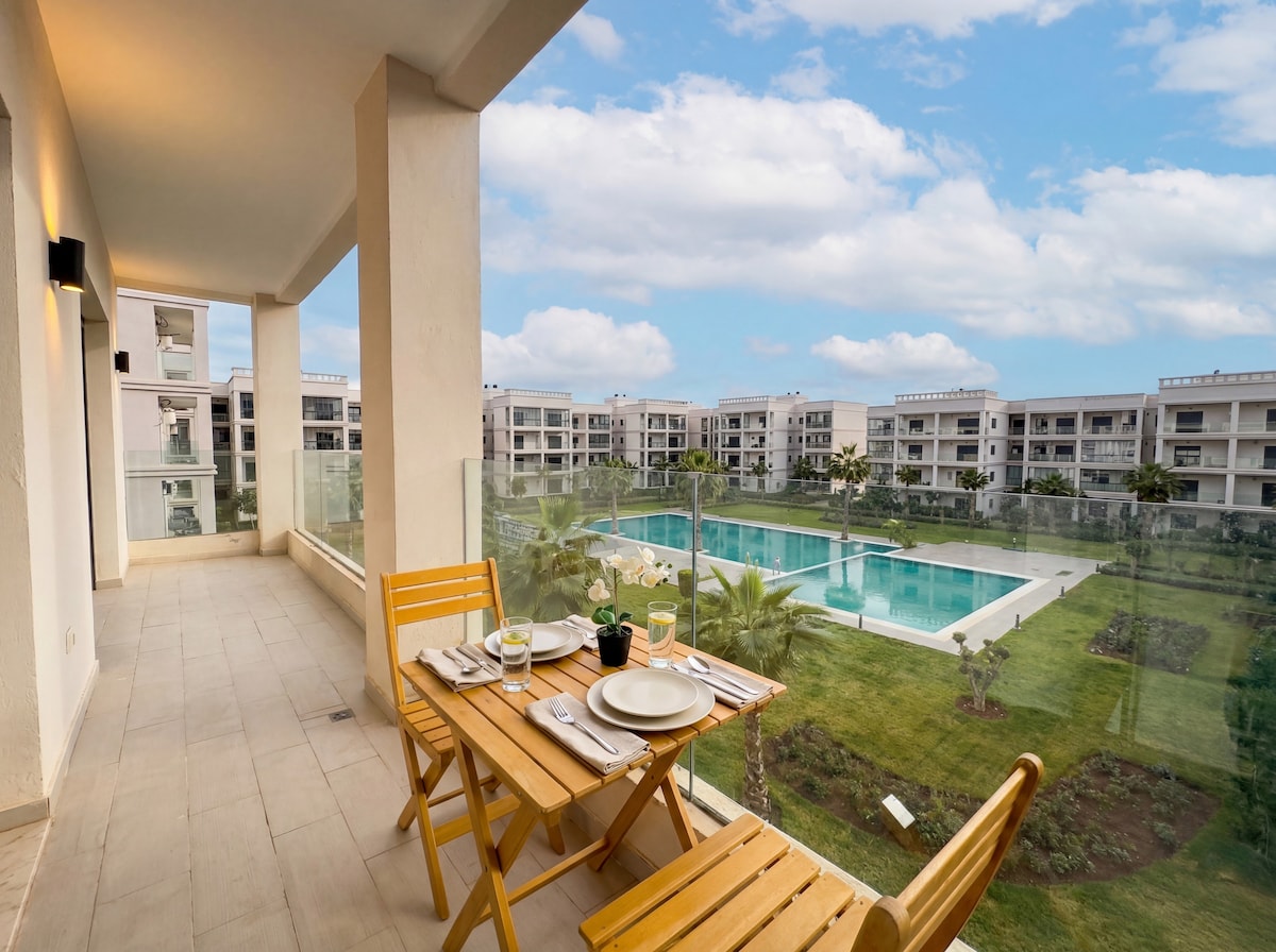 Superbe appartement au 1er étage avec vue sur piscine situé à Bouznika. • Suite parentale confortable avec TV et climatisation • Chambre enfants avec 2 lits individuels • Deuxième salle de bain • Cuisine entièrement équipée • Salon spacieux avec comptoir-bar, canapé confortable, chauffage, TV avec accès inclus à Netflix et Shahid • Wifi fibre optique haut débit • Piscine accessible • Parking privé sécurisé L’endroit idéal pour un séjour agréable, alliant confort, détente et modernité.