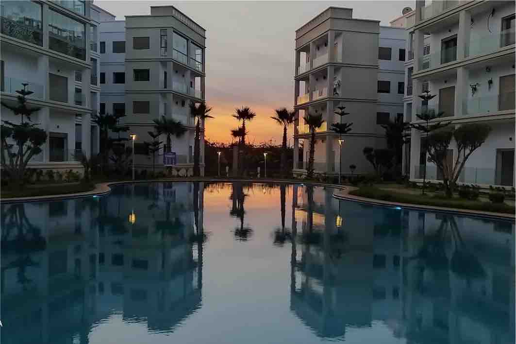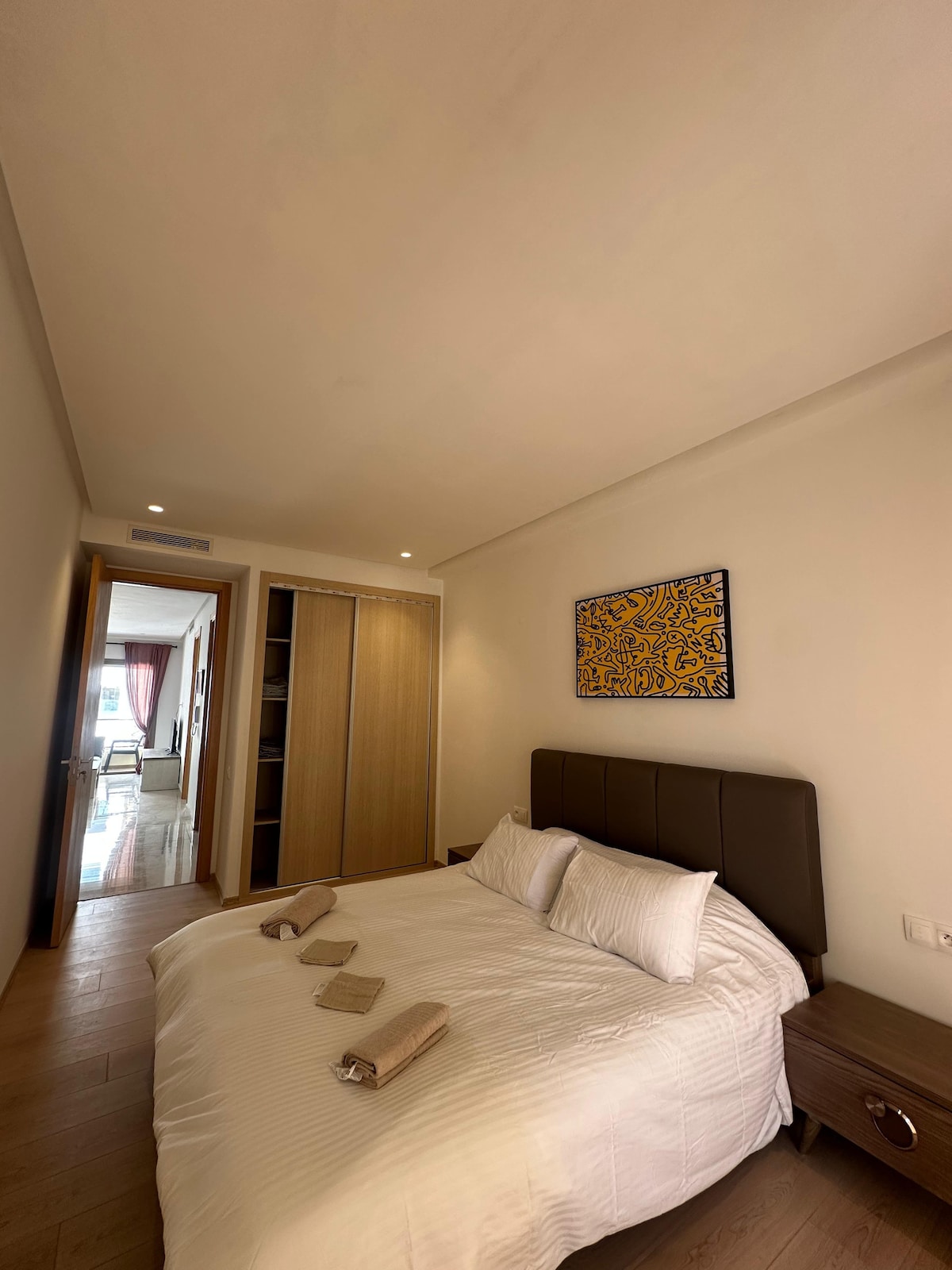 Appartement récent et moderne en location de vacance pour famille et couple marié dans la résidence Eden Island Oued Cherrat Bouznika fermée et sécurisée, salon + grande terrasse de 18m² + 2 chambres à coucher + 2 SDB. Appartement à 2 minute à pied de la mer et La résidence est de très haut standing et dispose de plusieurs activités pour adultes et enfants : mer intérieur (4 Ha), espaces verts, piscine, accès direct à la plage, parc de jeu, terrains de tennis de skateboard, mur d'escalade, etc..