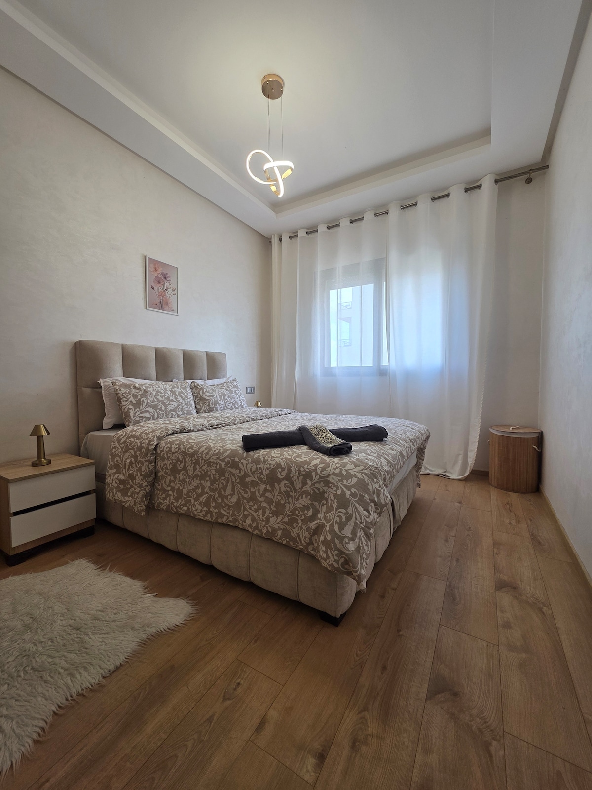 Profitez d'un nouveau logement décoré et vivant de la ville de Mohammedia. Entièrement équipé et d'une superbe vue sur la mer depuis la terrasse en orientation SUD. L'appartement est dans une résidence sécurisée (24/24 H) au cœur du parc de Mohammedia. - 5 mn à pied de la plage - 2 KM de la gare - 25 km de la mosquée Hassan II Cet établissement met à votre disposition un ascenseur, un service de sécurité et nous présentons une facilité de check-in et check-out grâce à notre serrure connectée.