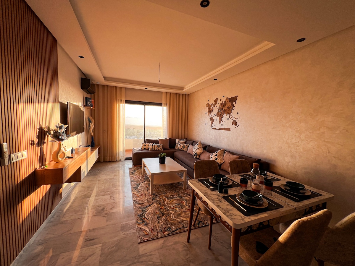 ☀️ Seaside Escape in Bouznika! Luxury 2-bedroom, 2-bathroom apartment at Évasion Bouznika — perfect for families, couples, or friends. Enjoy: 🌊 Sea view & quick walk to the beach 🏊 Direct pool access from your private terrace 🛏️ 2 bedrooms + bright living room 🛁 2 full bathrooms for extra comfort 🍽️ Fully equipped kitchen, WiFi, free parking Located in a calm, secure residence with 24/7 security. ✨ Comfort, sunshine & relaxation guaranteed!