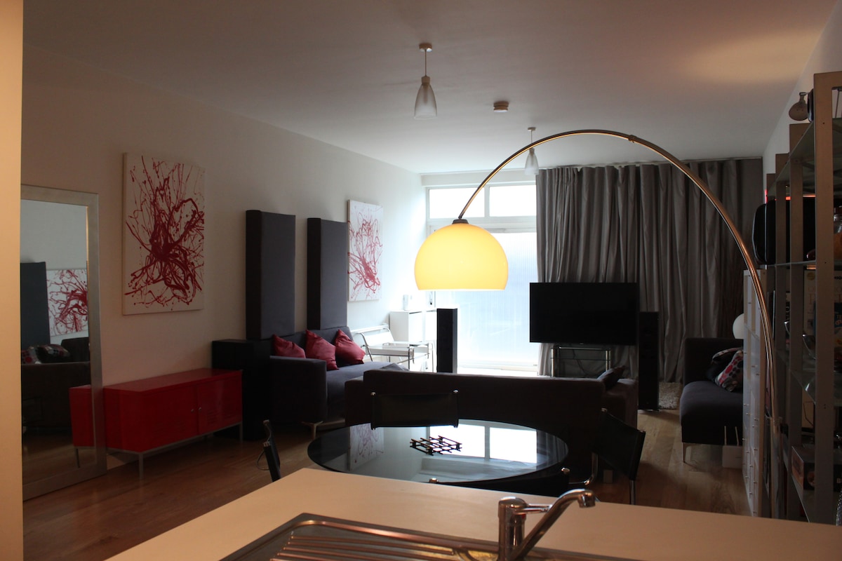 Windows to three sides. Uk second floor walk up, accessed from an external staircase. Boffi stainless steel kitchen. Superking (180cm wide) Tempur bed. Luxury 90cm wide, extra deep bath and shower. Up to 80 meg wifi. The building also houses a permanent family home, so a pile in from a bar at closing or after a party is not possible.