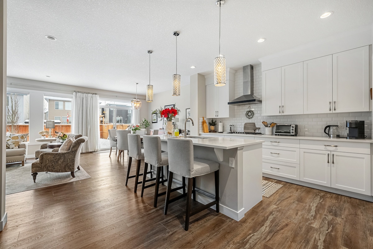 Welcome to beautiful and spacious Ravine Retreat House: - 4000+sqf , walk out to breathtaking ravine, Mountain View - Pool table entertainment - Free parking, Free bath and kitchen essentials, Free WiFi - Fully stocked kitchen; BBQ at balcony - Costco, superstores nearby - City centre, YYC airport 15 mins - Quick access to Banff - 6 bdrm 3.5 bath, - 10 beds: 7 twin +2 queen+1 king - A/C - Pet friendly (fee applied) - Perfect for multi-families, maximum 5 cars or 15 people at any time