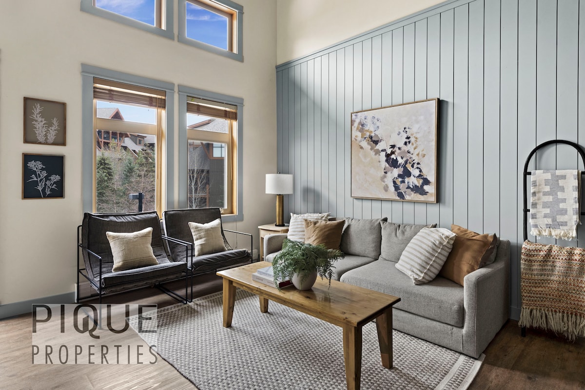 Toby 133 is a completely renovated, contemporary alpine loft. Located on the third floor of the Toby Creek condo complex, the soaring 20 foot ceilings and celestial windows fill the space with natural light. In summer, the rushing sounds of Toby Creek can be heard through open windows. The use of reclaimed wood and vibrant contemporary mountain art throughout give our home an eclectic, organic feel. An open but cozy, private sleeping loft hangs over the spacious living room and kitchen