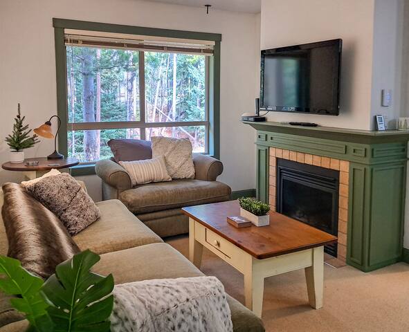 Fall in love with the Rocky Mountains in this creek side ski in ski out townhouse. Fully renovated, this beautiful Riverbend Panorama home, with a view of the mountains, is located steps away from the gondola and hiking trails along the picturesque Toby Creek. There are two separate bedrooms, each with their own full on-suite bathrooms, and a fire side queen size sofa bed (with upgraded foam mattress) in the living room to accomodate a total of six guests.