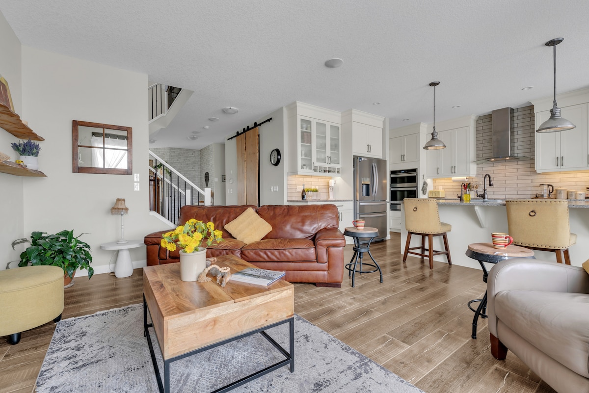 Vibrant four-bedroom family home steps from a scenic lake path. Relax year-round in the glass-enclosed sunroom with a 14’ swim spa. Enjoy a fully equipped kitchen, open living area, and peaceful garden shared with the hosts. All bedrooms are upstairs. located in the ❤️ of Heartland. 45 min from Calgary Airport. Doorbell camera at entrance for guest safety. Hosts live in a separate suite and are nearby if needed.