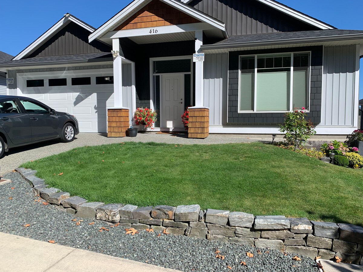 Welcome to our quiet 2-bedroom suite, perfectly located for VIU, NRGH, Westwood Lake trails and the Aquatic Centre. Whether here for a tournament, family visit or remote work, enjoy 250 Mbps fibre Wi-Fi, a sit/stand desk and air conditioning. Our kitchen is built for real cooking, with a cozy living area and garden patio to unwind. We personally prepare every detail to ensure a sparkling clean stay, with shared laundry and covered parking included. Well-behaved small dogs are always welcome!