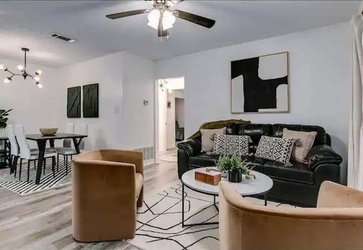 Welcome to our charming Airbnb for six guests with two bathrooms. Recently remodeled, it boasts a fresh, modern ambiance with new appliances and fixtures. Inside, enjoy a cozy, homey atmosphere with stylish living spaces and two modern bathrooms for privacy. The well-equipped kitchen is perfect for cooking. Outside, relax in the spacious backyard. Minutes from grocery stores, restaurants, and attractions, it offers easy access for a memorable stay, whether for business or pleasure.