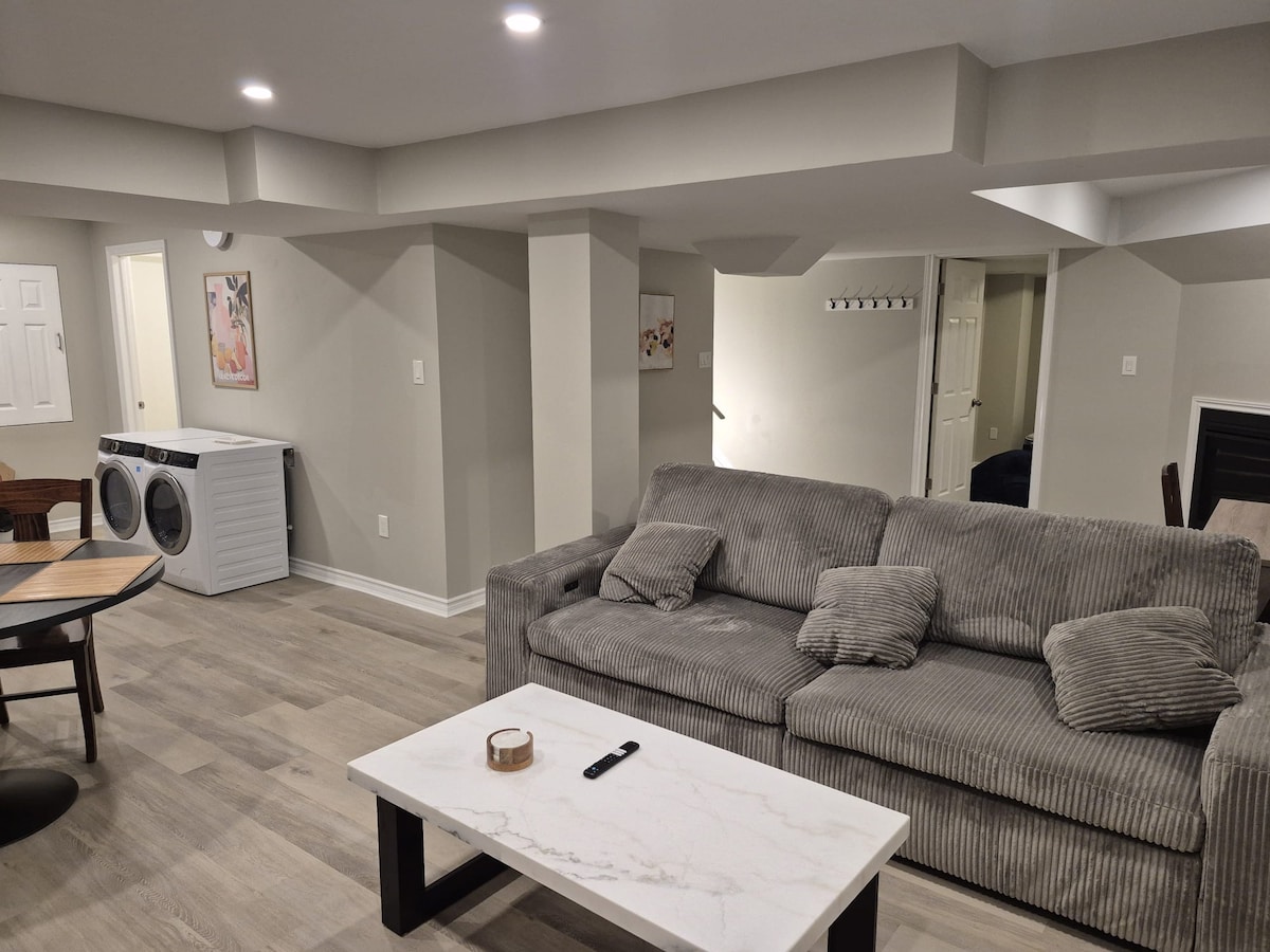 Welcome to your home away from home! This walkout basement has a private entrance and is newly constructed with a full bathroom and kitchen amenities, a spacious living room, indoor and outdoor dining areas, and a comfortable bedroom. Enjoy modern conveniences such as Wi-Fi and a 50" television with a fully paid Netflix subscription. Your convenience is our priority, with a designated parking space in the driveway for guests. Located nearby are popular dining options like Swiss Chalet, DQ, etc.