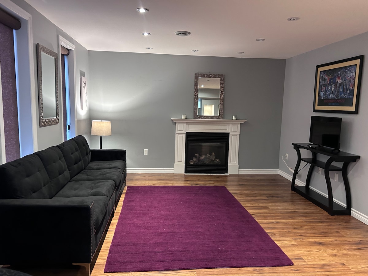 Welcome to your home away from home! This walkout basement has a private entrance and is newly constructed with a full bathroom and kitchen amenities, a spacious living room, indoor and outdoor dining areas, and a comfortable bedroom. Enjoy modern conveniences such as Wi-Fi and a 50" television with a fully paid Netflix subscription. Your convenience is our priority, with a designated parking space in the driveway for guests. Located nearby are popular dining options like Swiss Chalet, DQ, etc.
