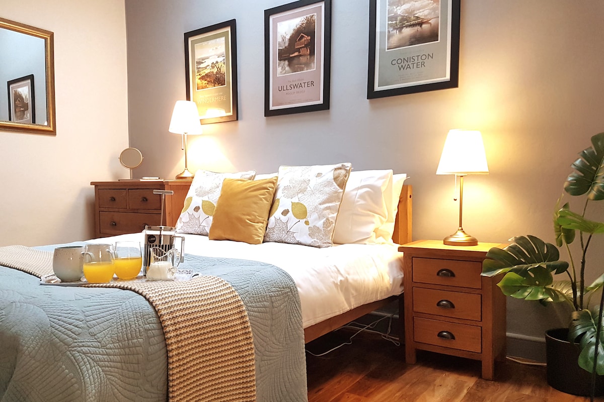 We love living here and we're sure you will love staying in our comfortable guest suite with private entrance. Just a short walk from lake Windermere and the centre of Bowness with all its shops, cafes and restaurants. Your suite is separate from the rest of the house and offers a delightful bedroom with comfy king size bed, French doors leading out to a small raised patio and a private, modern bathroom. Please note there is no kitchen, but we do provide a microwave, kettle, toaster and fridge.