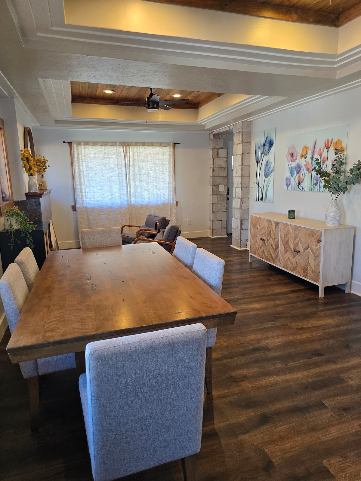 Spacious, family-friendly retreat with modern farmhouse charm. Enjoy a private sauna, hot tub, fire pit, full kitchen, and large yard with a trampoline—perfect for kids to play. Features 2 cozy bedrooms, laundry, and generous parking. Located near Lagoon, Downtown Ogden, ski resorts, lakes, hiking trails, and off-road parks. Thoughtfully designed for comfort, fun, and unforgettable family memories.