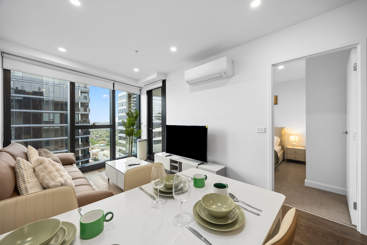 Welcome to Pudding’s Home Box Hill, a bright and modern high-rise apartment in the heart of Box Hill. Thoughtfully styled with brand new furniture, this cosy two-bedroom home is perfect for up to 3 guests, offering a comfortable city lifestyle with elevated views, gym access, and everything you need for a relaxed Melbourne stay. Ideal for business travellers, couples, or small families seeking convenience, comfort, and a clean, modern base.