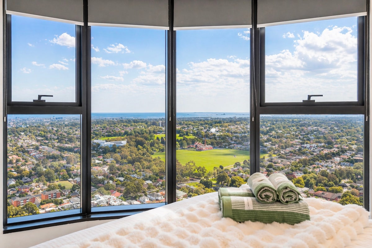 Immaculate one bedroom home directly under penthouse in the luxurious Whitehorse Tower - the tallest landmark outside of the Melbourne CBD. Suitable for travelers, business and couples. Located on level 34 under penthouse with a spectacular day and night views of Melbourne’s city skyline as well as Port Phillip Bay’s coastline and Dandenong Mountains Ranges. This unique position is a stand-out among Airbnb crowds in the same tower.