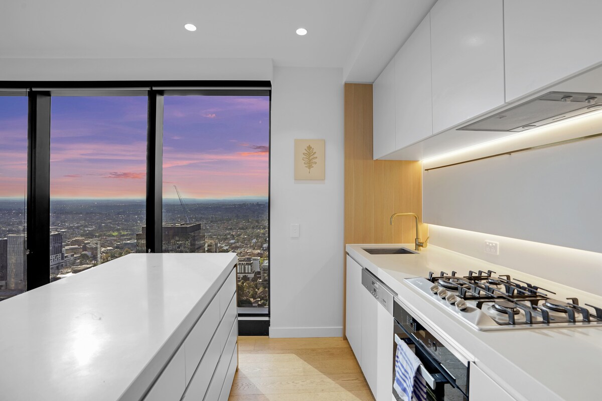 Sky One 35th floor high ceiling penthouse, stylish and luxury finishes, central of central location, spectacular city/ocean/mountain/sunset views. 3 bedrooms 3 baths, free parking, super high-speed wifi and smart TV netflix, zoned central aircon, free gym/pool/spa/saunas/lounge+other function rooms. Shopping centre downstairs: train/bus/taxi/tram stations, restaurants, banks and other shops all within 5 minutes walking distance second to none to satisfy all your needs in Melbourne second CBD.