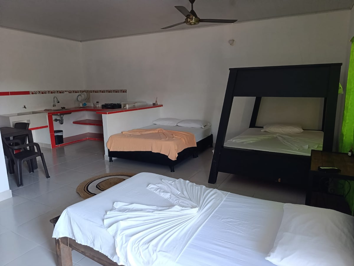 Te encantará este adorable lugar para quedarte. Apartaestudio funcional, cuenta con cocina equipada de utensilios basicos, zona de lavado de ropa (lavadero) Mesa con sus respectivas sillas, baño privado, aire acondicionado y ventilador, una cama doble, una cama sencilla, y un camarote de cama doble y cama semi doble. Somos Pet friendly.