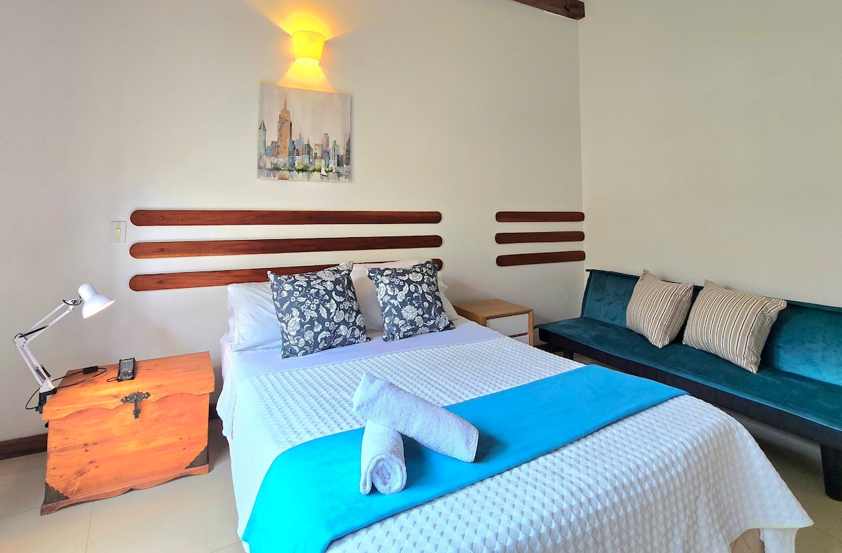 Apartamento espectacular de excelente ubicación. En todo el centro de Villa de Leyva, a tan solo media cuadra de la plaza Mayor y en la cuadra principal de este hermoso pueblo. Es un apartamento para parejas y se caracteriza por ser iluminado, ventilado naturalmente. Es tranquilo y hermoso, además tiene una cama super confortable de tamaño KING. Cuenta con TV, WiFi, agua caliente y tiene amplios espacios. Todo lo mejor de Villa de Leyva a tan solo unos pasos. Sofa cama en la habitación