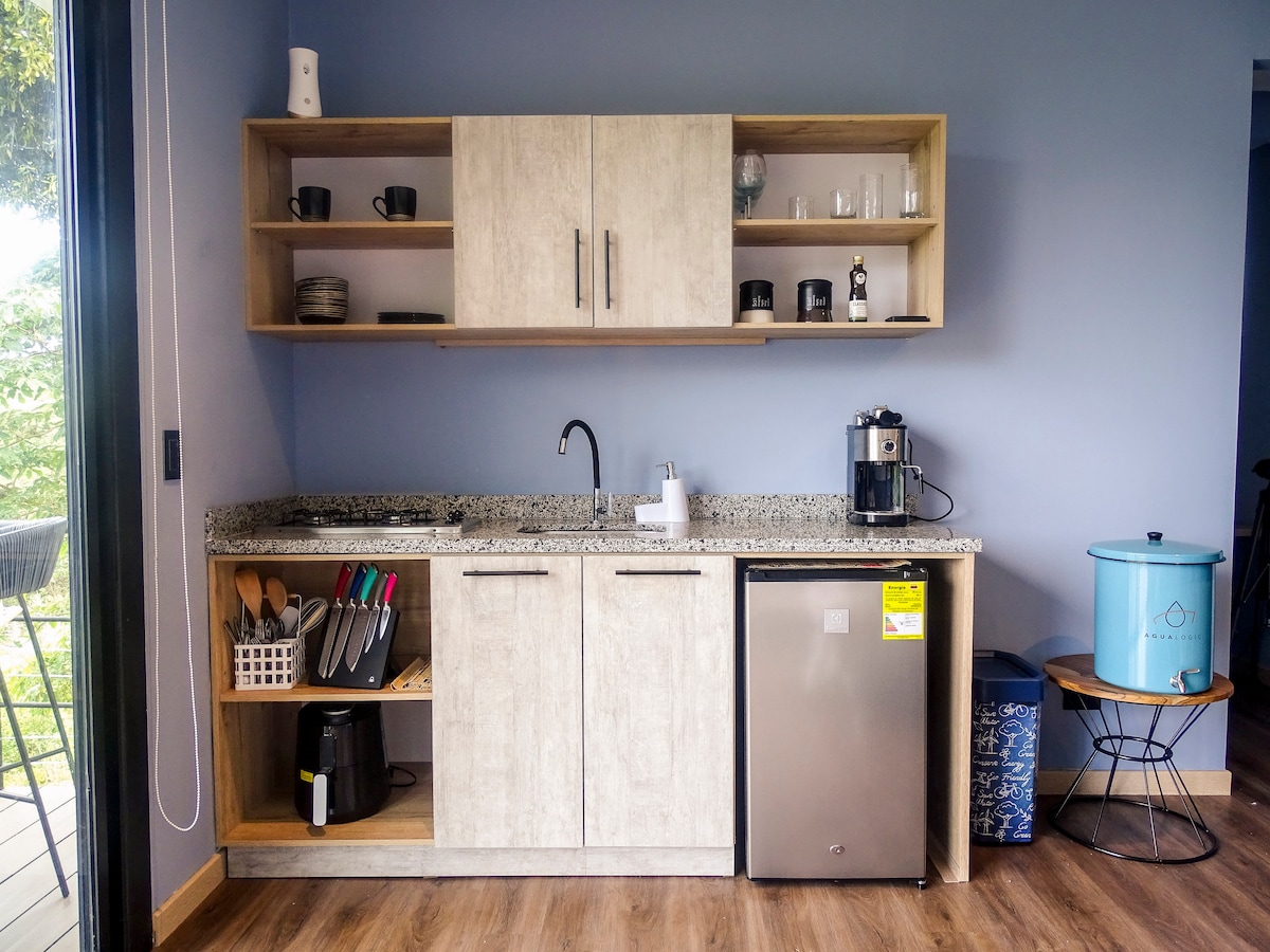 Tendrás la oportunidad de conectar con la naturaleza a través de una estructura que combina el vidrio y la madera en medio de un bosque privado. Solo tenemos un único glamping en medio de un bosque privado. Podrás salir del día, día, recargarte y descansar. Estamos a 60 km de Bogotá y tienes la posibilidad de montar en bicicleta, hacer senderismo, comer orgánico, comprar local y disfrutar de animales de granja y naturaleza. Es un espacio perfecto para parejas. No hay cocina.