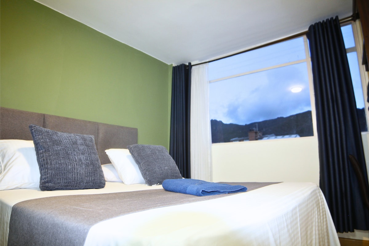 Esta linda habitación se encuentra en Casa Pancha Mama con una excelente ubicación a solo dos cuadras de la plaza principal. Es Ideal para que una pareja pase unos dias romanticos explorando la encantadora Villa de Leyva. Es amplia y acogedora aequipada con una cama doble y un banio completo . La habitacion tiene una hermosa vista al patio de la casa y a las montañas. Un delicioso desayuno esta incuido en el precio de la habitación.