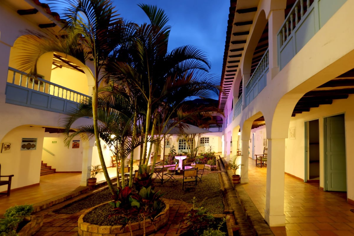 Esta linda habitación se encuentra en Casa Pancha Mama con una excelente ubicación a solo dos cuadras de la plaza principal. Es Ideal para que una pareja pase unos dias romanticos explorando la encantadora Villa de Leyva. Es amplia y acogedora aequipada con una cama doble y un banio completo . La habitacion tiene una hermosa vista al patio de la casa y a las montañas. Un delicioso desayuno esta incuido en el precio de la habitación.