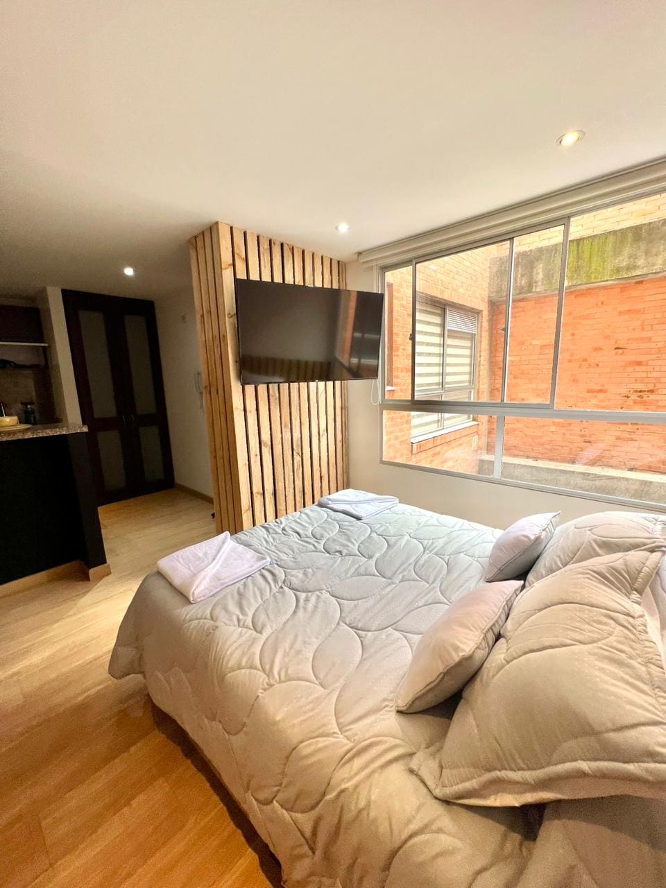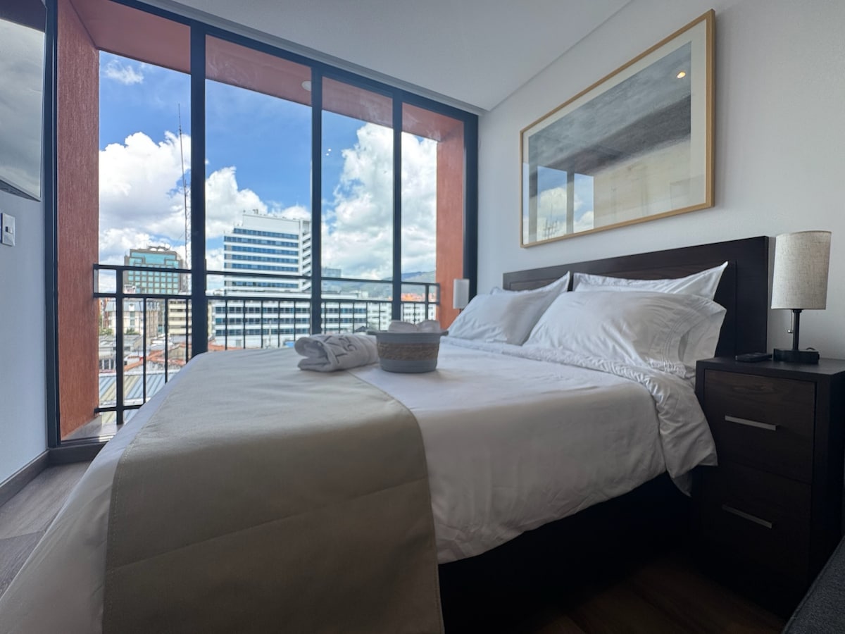 A pasos de Andino/Retiro/Atlantis, en Muttuo. WiFi rápido + escritorio cómodo para trabajar +estación de café, balcón, vista panorámica cerros orientales. Cama doble colchón ergonómico con blackout para descansar. Recepción 24/7 y llegada sencilla. Edificio nuevo con zona de coworking, terraza vista panorámica a la ciudad y zona BBQ.