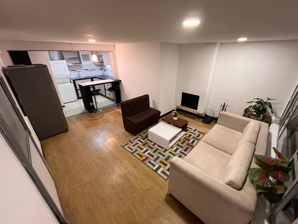 Our comfortable one bedroom apart-studio, interior location with windows towards a garage, and to a courtyard, bohemian, minimalist, with a small garden has a true city feeling! It comfortably accommodates four people and it´s centrally located on a street, with easy access to Simon Bolivar Metropolitan Park. Enjoy a complete kitchen, and access to Transmilenio. This space is ideal for two people; however, we provide a high quality sofa bed for two more people should the need arise. Hot water