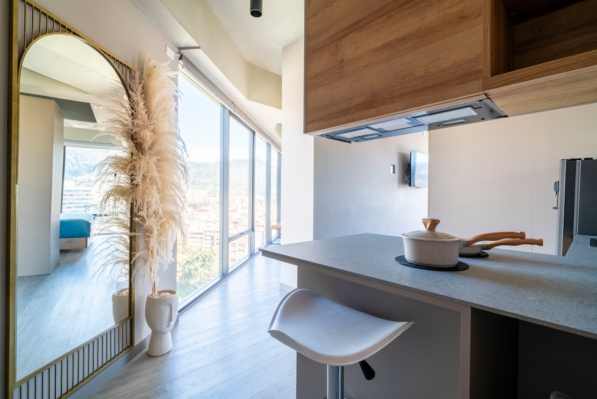 Welcome to a stylish and centrally-located place! Gorgeous 15th floor apartment with an UNBEATABLE VIEW. Our building offers top-of-the-line amenities, including an indoor pool, sauna, spa room, gym, terrace, bar, and rooftop restaurant. You'll feel like you're staying in a hotel with the convenience of an Airbnb. Close to Parque 93, you'll have the opportunity to experience local and international cuisine from some of the best restaurants in the city.