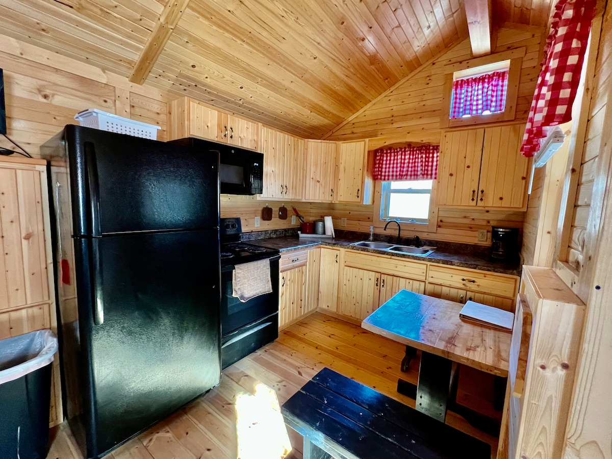 Beautiful camper where you & 6 of your best friends can come gather, create & cherish the memories made here @ the campground. This "Wildwood" camper has a qn, 3 bunks, a table that breaks down into a bed & a futon couch. You'll be able to relax on site with all the modern accessories you can find at home. There's a fire pit, outdoor kitchen, awning, picnic table & some chairs. When not at the camper, head over to the lake and hit the beach & swim.