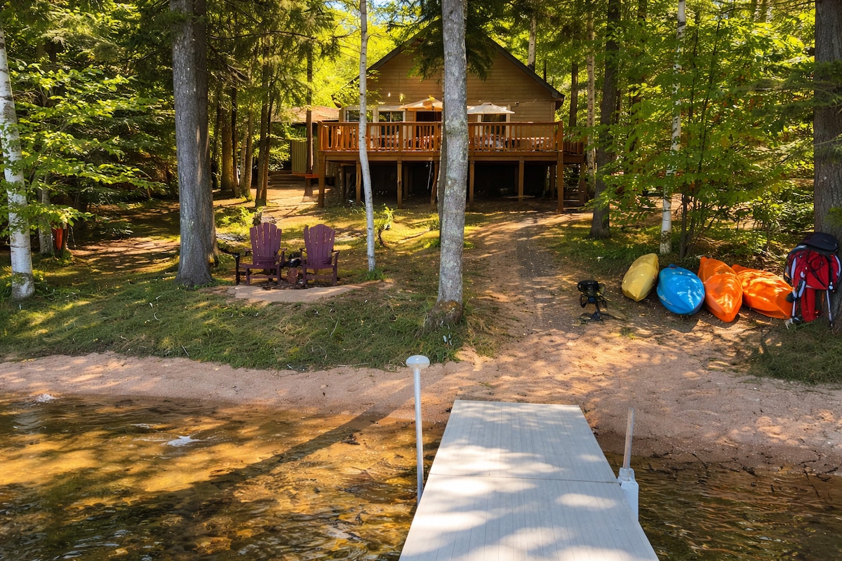 This is a beautiful, family and dog-friendly chalet on wonderfully pristine Cub Lake between Kalkaska and Grayling. The home features a huge multi-level deck with lakeview and a new year-round spa / hot tub on the deck with a view of the lake. Also includes private lakefront with a dock, raft, bonfire ring with chairs, 4 kayaks, 3 paddleboards, a canoe, and a pedal boat! Works both as a great family or small group vacation home as well as a wonderfully romantic getaway for couples!