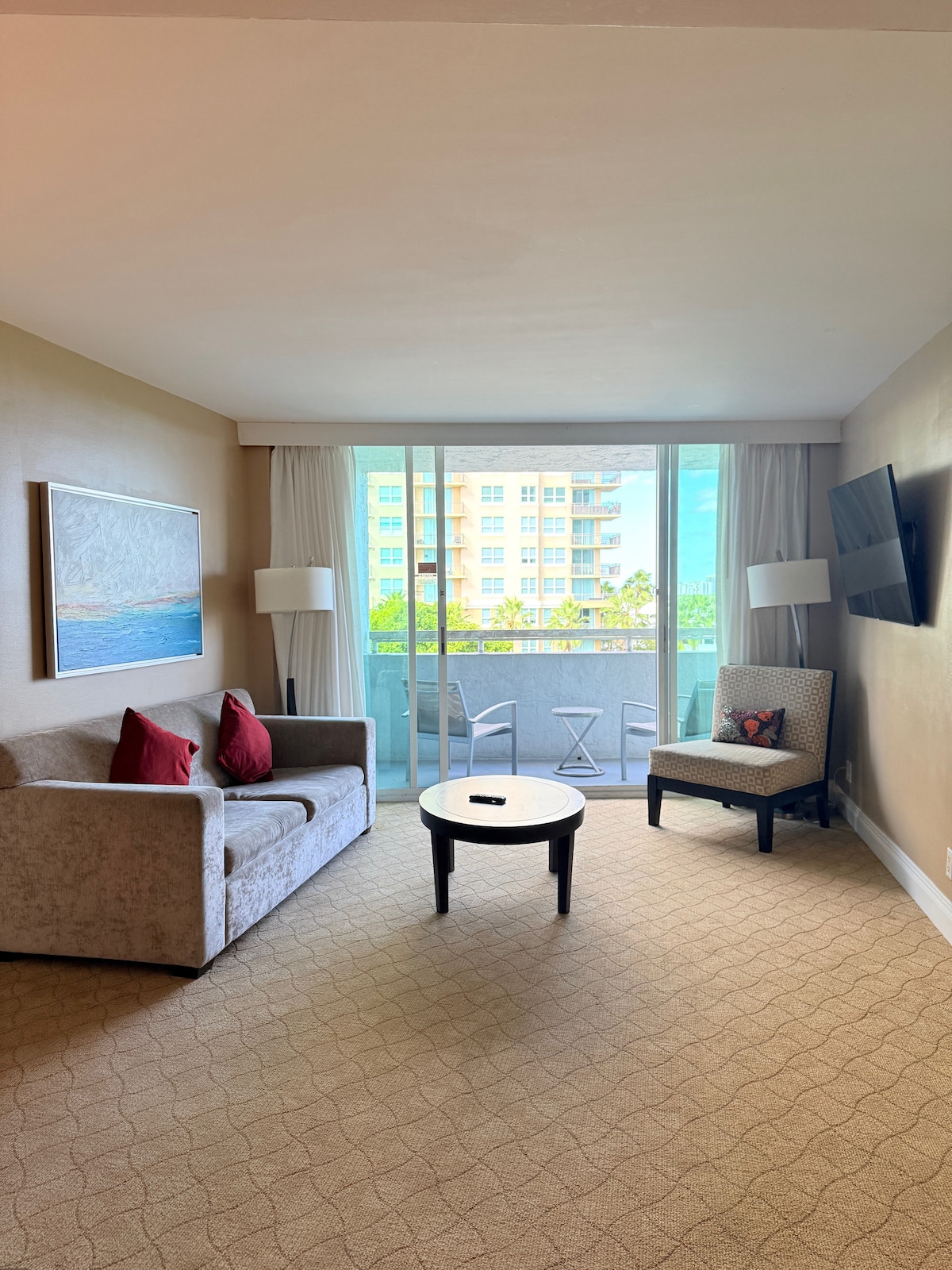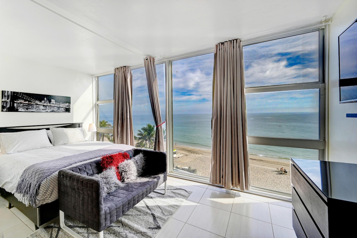 Ocean / Beach side views from master bed & indoor balcony! Beach is on premises - Free beach access- No resort fee! Fully Renovated NOTE: WE HAVE 3 UNITS-INQUIRE IF Booked . Sleeps 9-Large cozy 2 bedroom condo -Large pool. Located on premises :Spa-Coffee bar-Yoga-Tiki Bar-Sports bar-Happy Hour-D.J -Jet ski rentals ( next door ) & more..Outdoor Dining on the beach- indoor restaurant with entertainment Free shuttles to local restaurants! 2 blocks from Dunkin-Liquor-Publix -pizza-& more