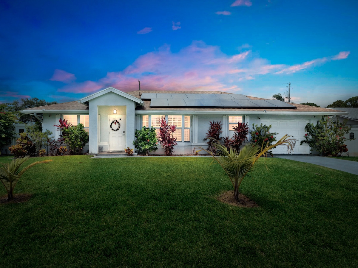 Indulge in this elegant 3BR/2BA retreat with upscale amenities for golf lovers and outdoor enthusiasts. Nestled on a lush ½-acre lot, it boasts a 35’ heated saltwater pool with tanning ledge, a tiki hut with bar, fridge, wine cooler, grill, sink & TV. A new large driveway fits 3 cars. Practice on the private 6-hole putting green, explore nearby courses, or unwind at stunning Florida beaches just 10-12 minutes away. This stylish escape is perfect for entertaining, relaxation and fun.