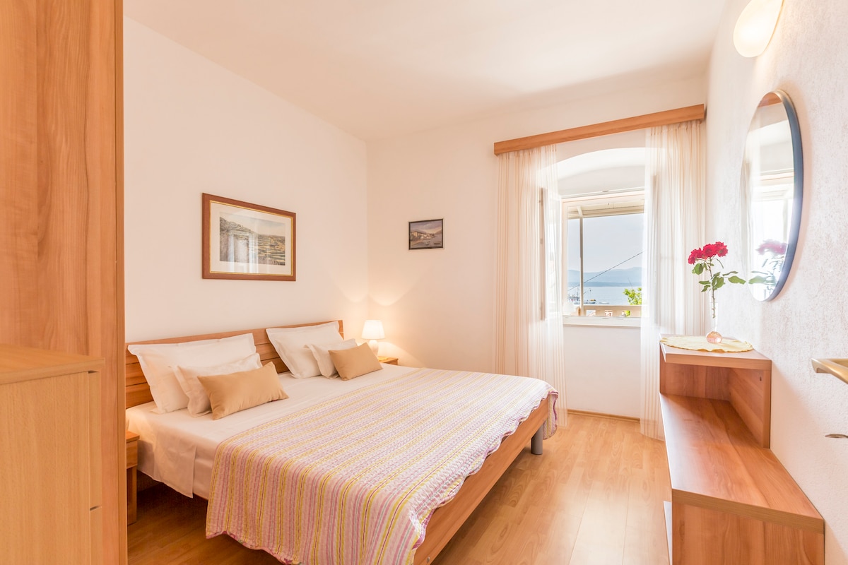 Obiteljska kuća, renovirana. Nalazi se minutu hoda od centra mjesta, uz samo more. Kuća raspolaže vlastitim parkiralištem. Apartman se nalazi na prvom katu kuće, zaseban ulaz u apartman. Površina apartmana je 32 m2 i natkrivena terasa od 15 m2. Pogled na more. 2 ležaja i 1 pomočni ležaj: spavača soba sa bračnim krevetom ( 200x180) i sofa (200x140). Kupaonica sa toaletom i kuhinja sa blagavaonom. DODATNA OPREMA: klima, wi-fi, tv+sat, toster, aparat za kavu,sušilo za kosu, sef.