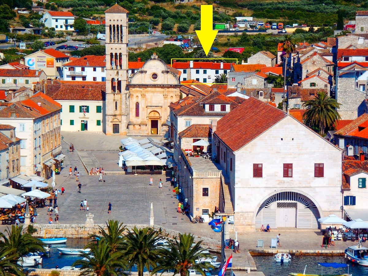 Brand New! The Penthouse is a professionally designed, serviced apartment located 100m from the sea on a peaceful square in the heart of the bustling, historical centre of Stari Grad. This eco-conscious apartment includes A/C, fully equipped kitchen, dining area, living space, Netflix, luxury bathroom , wifi, King bed. Hike/cycle from your door, stroll to the beach & dive into the Adriatic & discover amazing restaurants/bars around the corner.