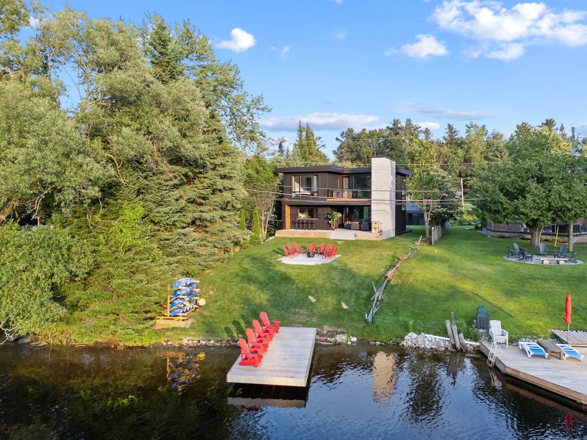 Welcome to our private, modern Scandinavian-style cottage, set on 3 acres of pristine land with conservation property across the water, ensuring ultimate privacy and tranquility. The cottage boasts floor-to-ceiling windows that invite natural light and offer stunning views of the Muskoka River and surrounding nature. Just 40 steps from the front door, you'll find a private beach and dock, offering calm, clear waters perfect for swimming—ideal for families with children.