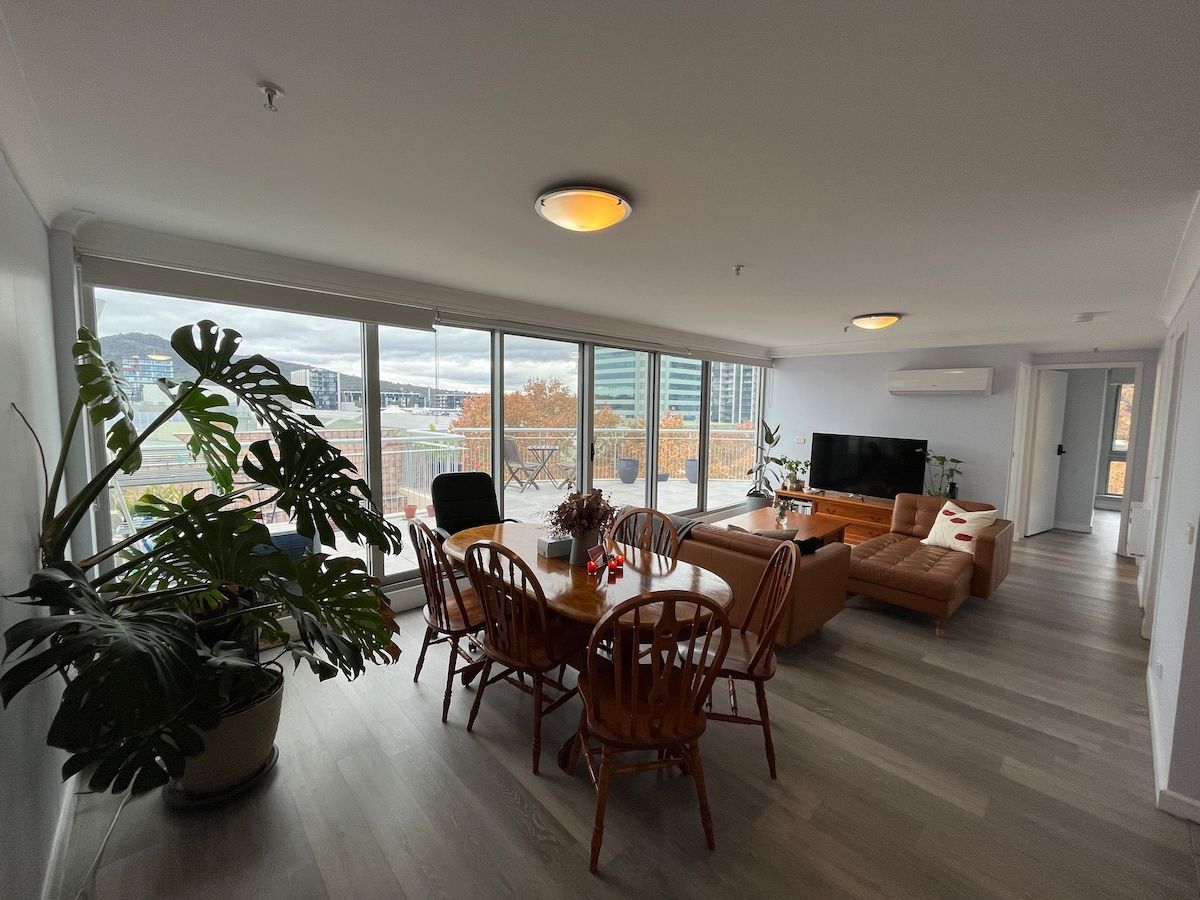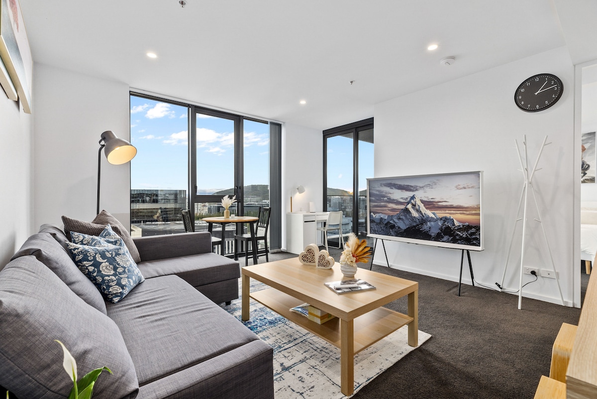 *Book today to unveil the beauty of this lovely apartment :) Key highlight: - 2 Complementary Secured Parking - Rooftop BBQ area with 180° Mountain View (Building Amenities) - 2 mins walk to Canberra Center - 5 mins walk to Lonsdale St (Place for good restaurants n pubs) - 6 mins drive/17 mins walk to the ANU - 8 mins drive to Canberra airport - 9 mins drive to Mount Ainslie Lookout Our stylish apartment has roller blinds and quality mattress to comfort your stay.