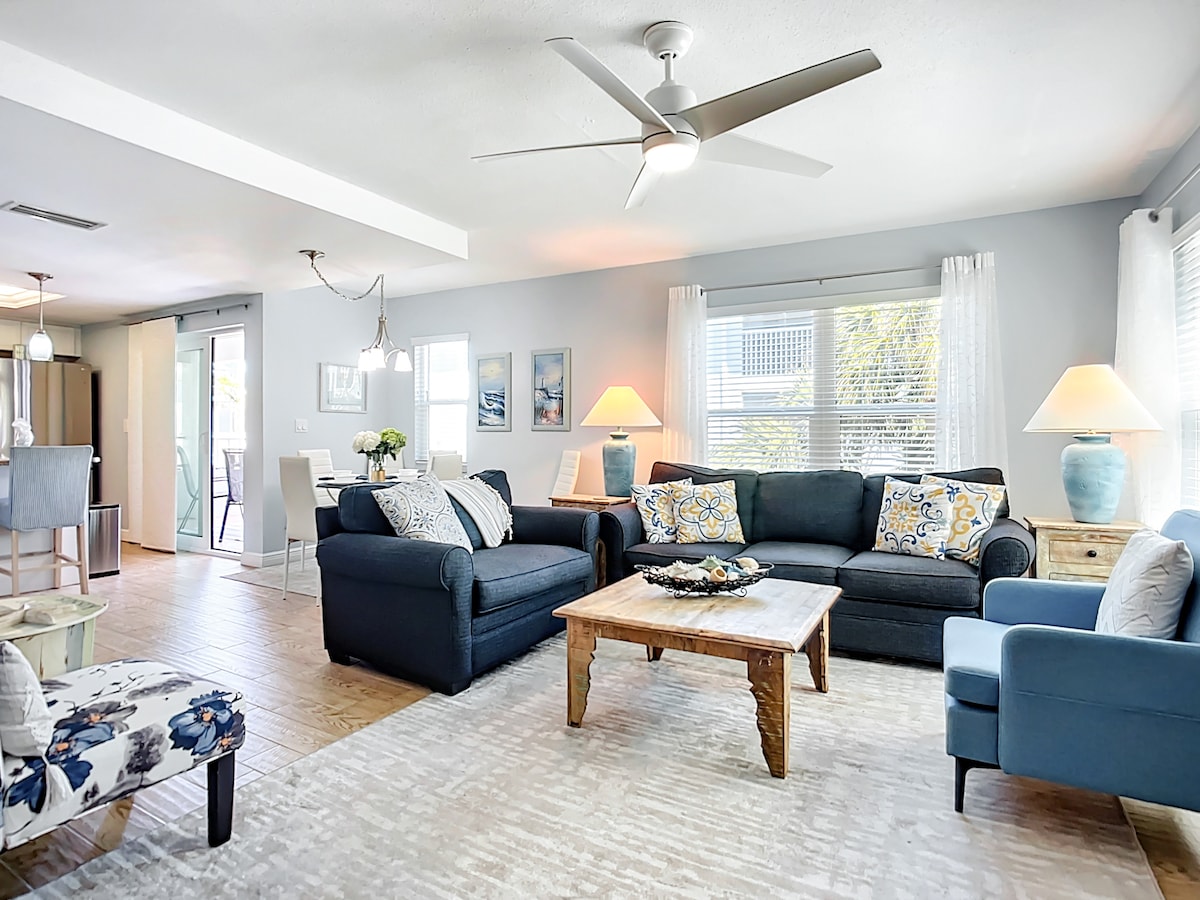 One block from beautiful beach & waterfront dining. Newly renovated Villa in quaint quiet condo building close to everything on Anna Maria Island. Pickleball across the street. Pool literally out your back door. Perfect for a small family or a romantic getaway. *Min. renter age 25. Two minute walk to beach, trendy Bridge Street shops, marina, restaurants, bars, boat tours, mini golf and more. Brand new beds, furniture & appliances. Kitchen has everything you need. Beach supplies in hall closet.