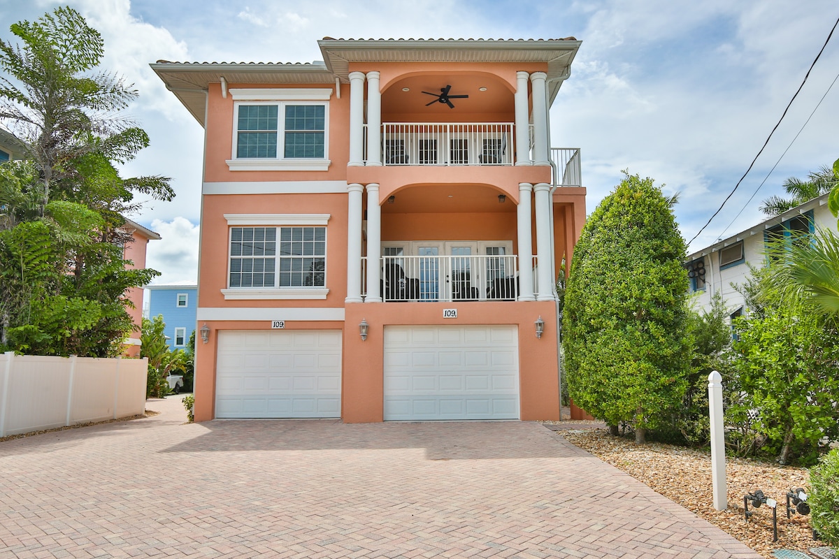 Less than a 2 min WALK to the white sand beaches of the Gulf, this 4 BR home comfortably sleeps 8. Large bedrooms & a spacious floor plan (the kitchen, dining and living rooms flow together), the house is perfect for families. The bedrooms are split 2+2 & paired with bathrooms on opposite ends of the house (a pocket door adds privacy). Private heated saltwater pool sits amidst the tropical yard. Hop on the free trolley and explore Florida's gorgeous Anna Maria Island.