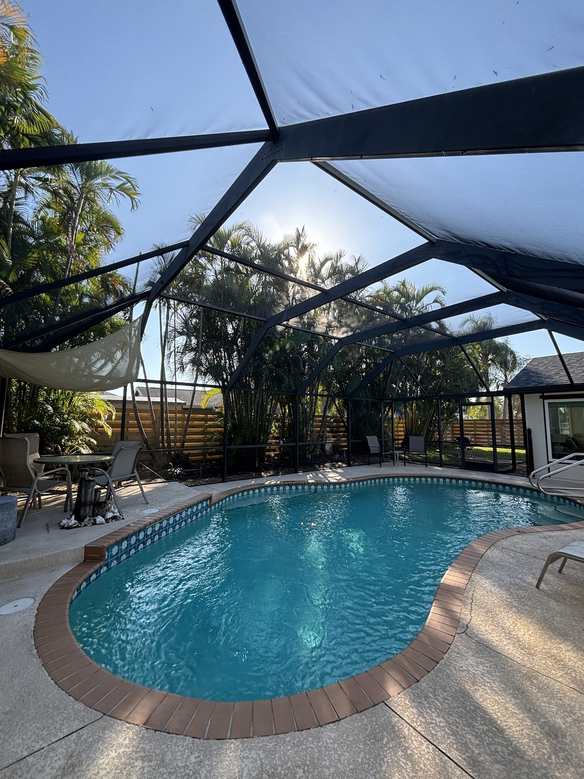 Private 3 bedroom single family home 4 miles to white sand gulf beaches Longboat Key and Anna Maria Island. HEATED SALTWATER POOL home with access to ride bikes to the beach. Spread out in the oversized backyard with your own private pool and sitting area, featuring artificial turf yard and putting green, and beautiful landscaping. All hurricane damage has been repaired. The fence is fixed and the backyard is again completely private. The pergola pictured in photos was lost in the storm.