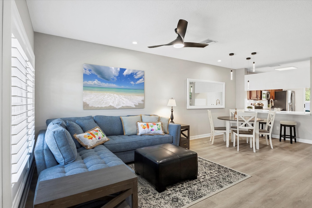 The property is a single-family residence with two apartment units. The apartment for lease (A) is in the front 1-bd/1-ba unit with a separate entry and gravel parking area. Lush landscaping, with covered and uncovered patio decks. The entry has a private screened porch. Large gathering room upon entry with a large kitchen area. Flooring is all resilient type (no carpet) containing faux wood plank vinyl or ceramic tile. - Quality beaches < 20 min - Local shops & restaurants just minutes away