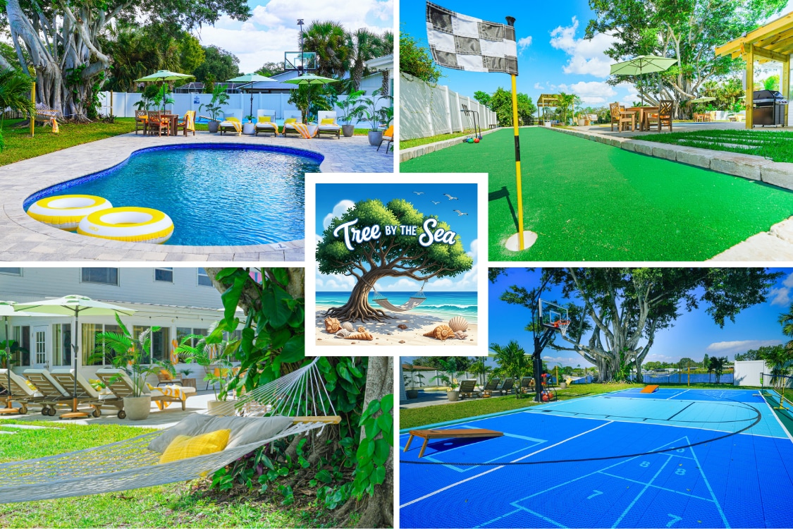Welcome to Tree by the Sea, a private lakefront 5BR resort just minutes from AMI. Enjoy a heated pool, pickleball/basketball court, bocce/putting green, shuffleboard, and a sunset firepit lounge by the lake. Inside, relax in two game rooms, play on the Infinity Game Table, and unwind in coastal-themed bedrooms and the hammock grove. Perfect for families and groups. Designed for relaxation, connection, and play, Tree by the Sea delivers a true resort-style experience.