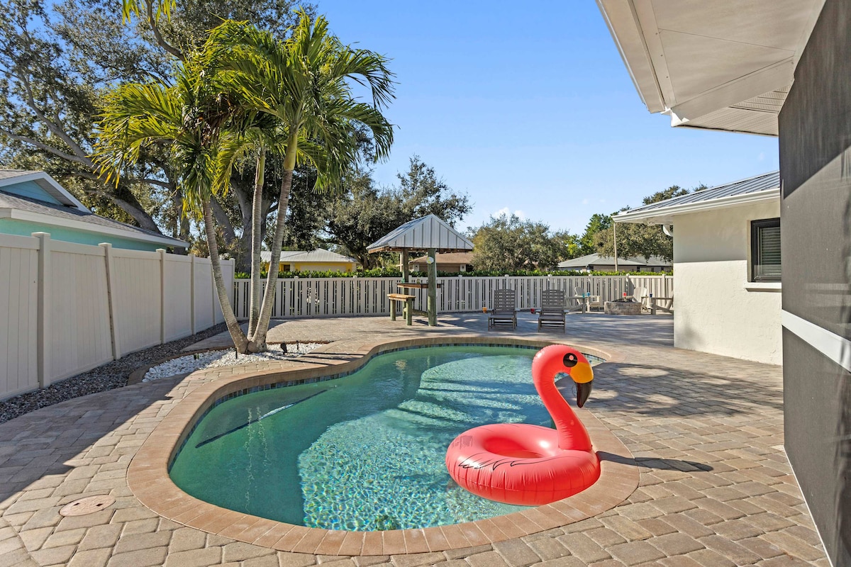Private 3 bedroom single family home 4 miles to white sand gulf beaches Longboat Key and Anna Maria Island. HEATED SALTWATER POOL home with access to ride bikes to the beach. Spread out in the oversized backyard with your own private pool and sitting area, featuring artificial turf yard and putting green, and beautiful landscaping. All hurricane damage has been repaired. The fence is fixed and the backyard is again completely private. The pergola pictured in photos was lost in the storm.