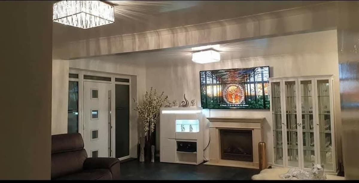 Comfortable, luxurious 4 bedroom detached house with three modern living rooms and a spacious garden containing a jacuzzi which accommodates 6-7 people and a large fish pond with Koi & Butterfly fish. Home has a grand kitchen fully equipped with amenities such as a wine cooler, in-built ovens, microwave & coffee machine. There's an office room which contains a sofa bed; has free private parking; exercise equipment is available and booking is available for 24/7. Around views of Moorside hills.